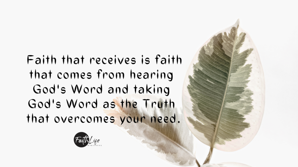 Faith that receives is faith that comes from hearing God’s Word and taking God’s Word as the Truth that overcomes your need. As a believer, you have all of God’s promises available in His. Take God’s promises for your use!