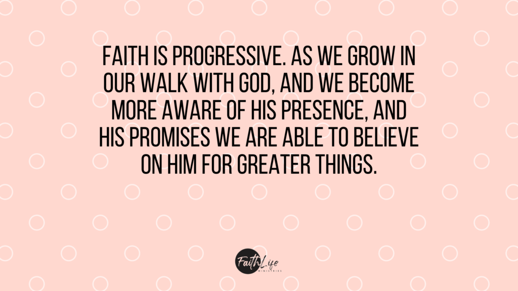 Faith is progressive. As we grow in our walk with God, and we become more aware of His presence, and His promises we are able to believe on Him for greater things. When I started my walk with God, I had little faith, and I only would pray for things for myself and my family. I would ask for personal material needs, but I did not believe God wanted to heal my headache as much as He wanted to provide for me, so I would suffer physical pain because I didn’t yet understand God could heal.