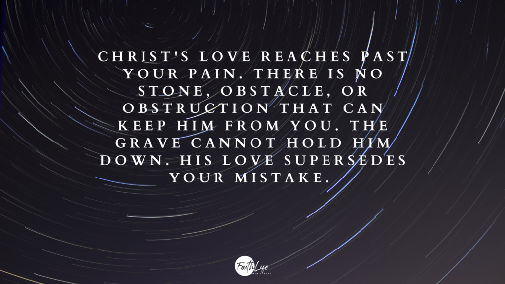 Christ’s Love reaches past your pain. There is no stone, obstacle, or obstruction that can keep Him from you. The grave cannot hold Him down. His Love supersedes your mistake. His Love supersedes your failures. His Love supersedes your struggle. He rose so that you can live. Choose to live in Christ and choose to start again.