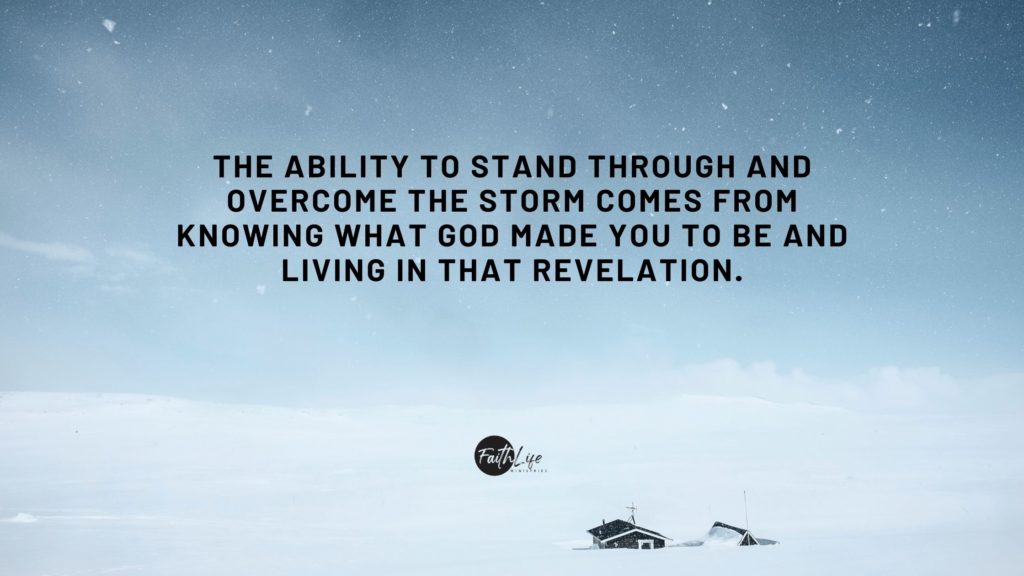 The ability to stand through and overcome the storm comes from KNOWING WHAT GOD MADE YOU TO BE and LIVING IN THAT REVELATION. I am not talking about personality traits as being shy, strong-willed, or expressive. I am talking about living in the identity of who you are in Christ.