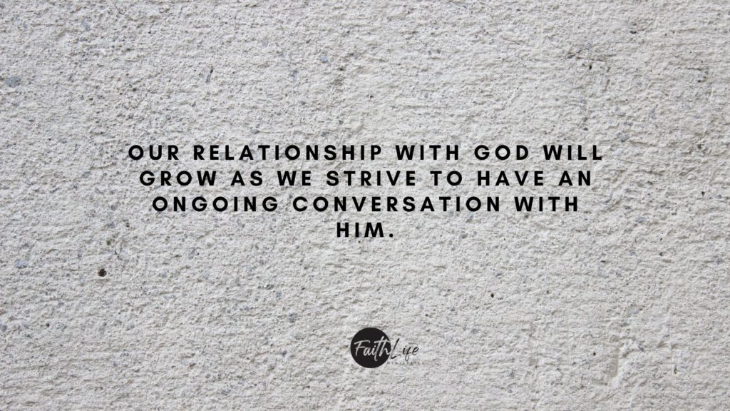 Our relationship with God will grow as we strive to have an ongoing conversation with Him. Both short and long prayers have their place. But we can’t just expect to get to know him in a five-minute segment each morning. We have to bring Him into our daily lives and allow Him to breathe His peace, hope, comfort, and guidance into every aspect of it.