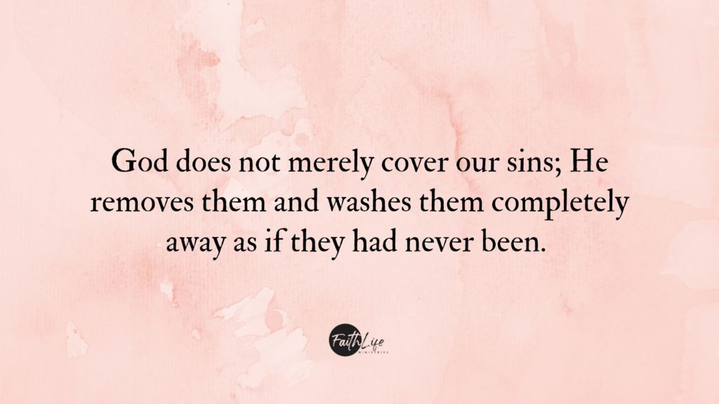 Remember the Father washed us! When you love something, you take care of it—whether it’s a car, a home or something more precious like a child. Well, God loves you so much, that He couldn’t fathom your sin separating you from His holy presence for eternity. So, He did something about it. He washed you. He removed your sin. Sin brings death. But He could only remove it with something more powerful than sin and death. The Bible says that LIFE is in the blood. So, the spotless blood of Jesus, brings His LIFE, canceling out our sin and death! Life conquers death! God does not merely cover our sins; He removes them and washes them completely away as if they had never been.