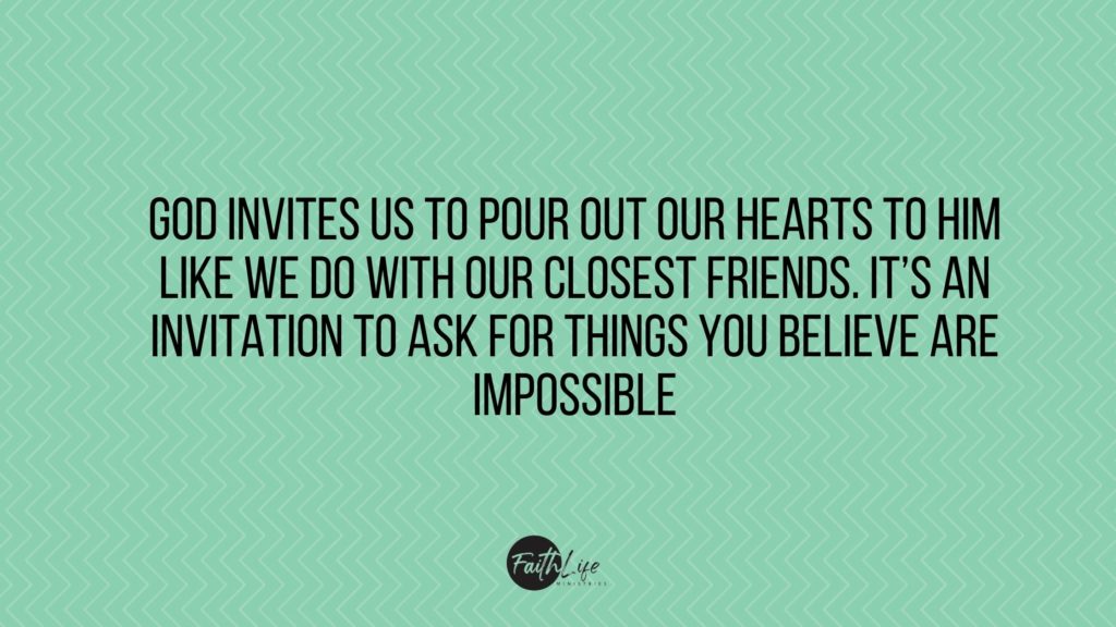 God invites us to pour out our hearts to Him like we do with our closest friends. It’s an invitation to ask for things you believe are impossible — a healed relationship with your parents, a friend coming to church with you, or financial provision for something you want done.