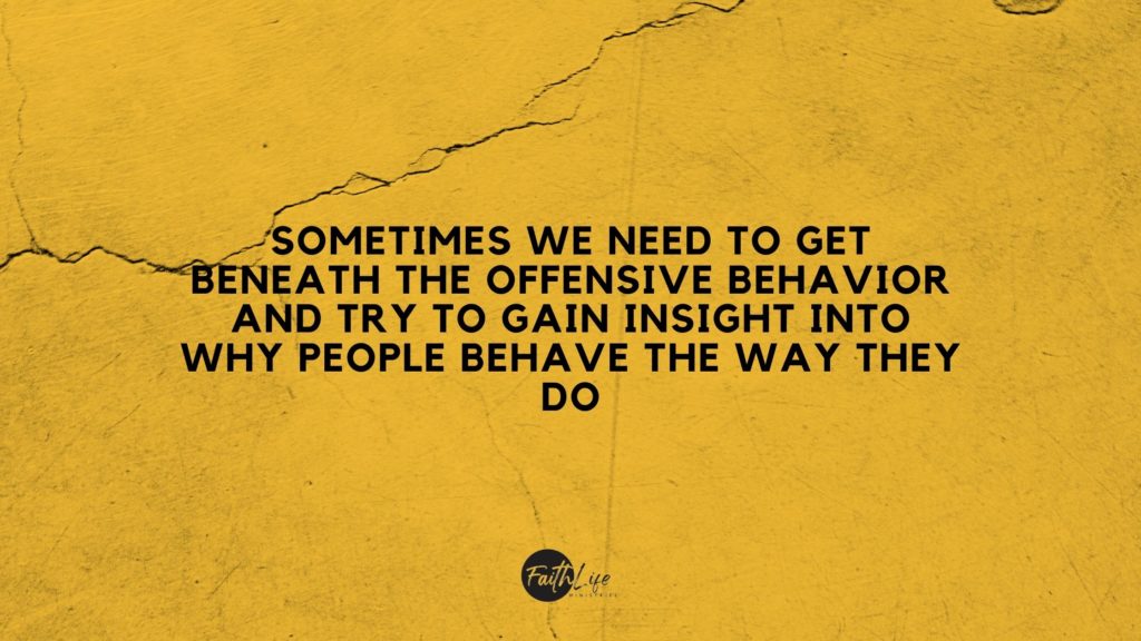 Sometimes we need to get beneath the offensive behavior and try to gain insight into why people behave the way they do. We may wonder why someone said that offensive thing. A lot of times it’s because they’re afraid and insecure. But, we don’t perceive their insecurity, their fear, their inferiority. All we hear are the insults.