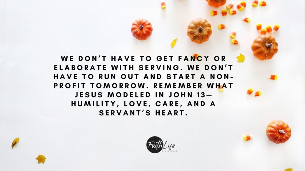 We don’t have to get fancy or elaborate with serving. We don’t have to run out and start a non-profit tomorrow. Remember what Jesus modeled in John 13—humility, love, care, and a servant’s heart. This is what He’s asking of us.