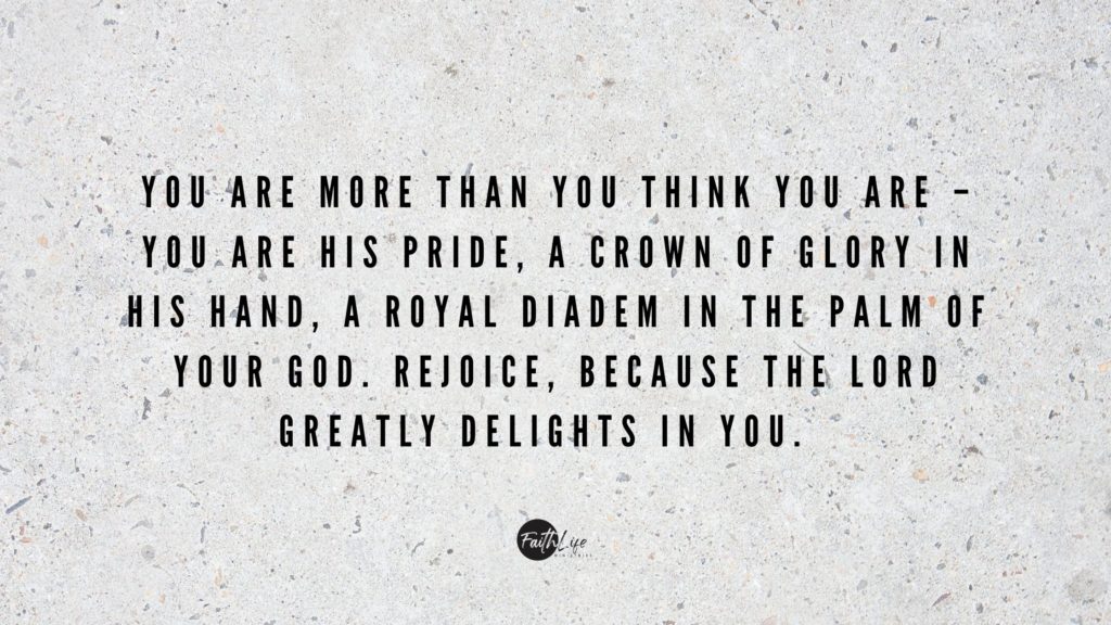 When the LORD delights in you, the World is not going to make it easy for you. That’s why Jesus prayed the High Priestly prayer (John 17: 1 – 26). When your trust to the LORD is mocked by your friends, when evil sets trap to abuse purity, when goodwill is questioned, when character is brutally tested, when holiness is seen as a weakness, when innocence is exposed, when faith is the reason for people’s rejection – be glad and keep shining in holiness, love and beauty. You are more than you think you are – you are His pride, a crown of glory in His Hand, a royal diadem in the palm of Your God. Rejoice, because the LORD greatly delights in you.