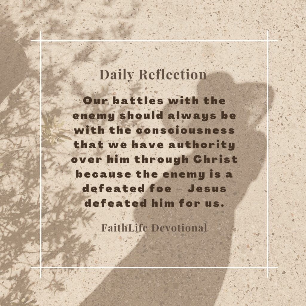 Our battles with the enemy should always be with the consciousness that we have authority over him through Christ because the enemy is a defeated foe – Jesus defeated him for us. And when we are born again, WE receive this authority! We inherit the Name of Jesus that is above EVERY name, and now we can use that Name against the enemy!