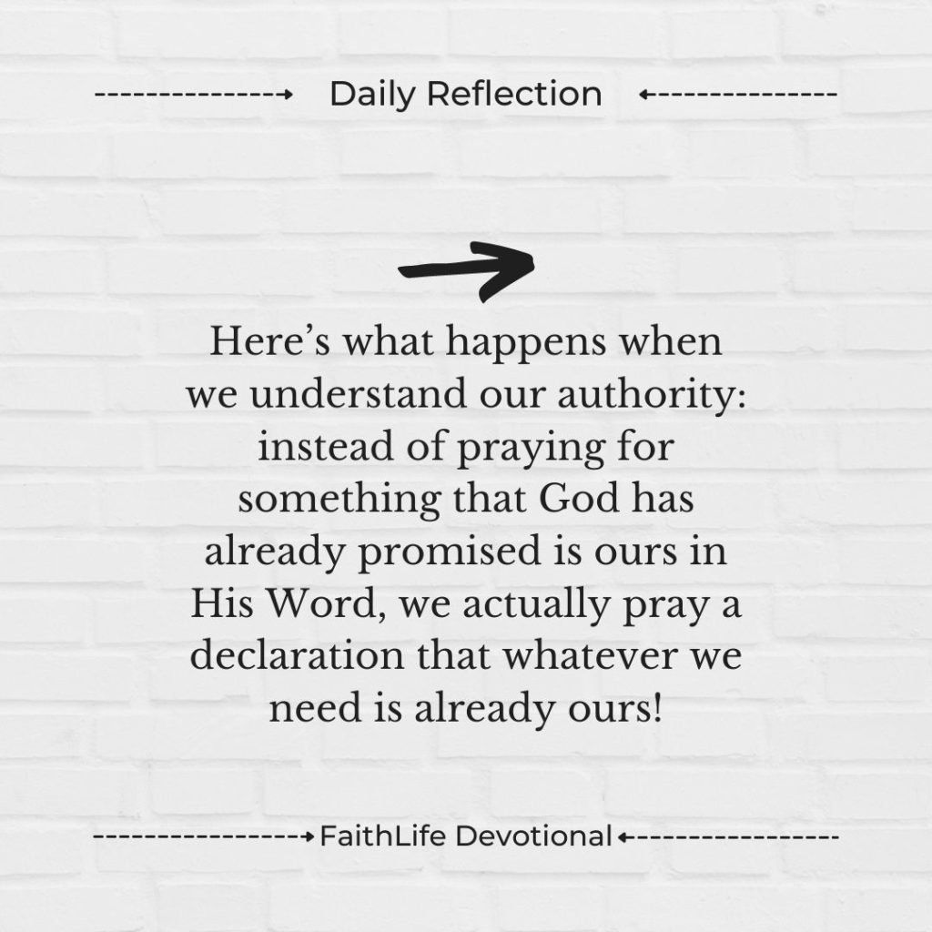 Here’s what happens when we understand our authority: instead of praying for something that God has already promised is ours in His Word, we actually pray a declaration that whatever we need is already ours! We don’t pray FOR victory; we pray FROM a place of victory.