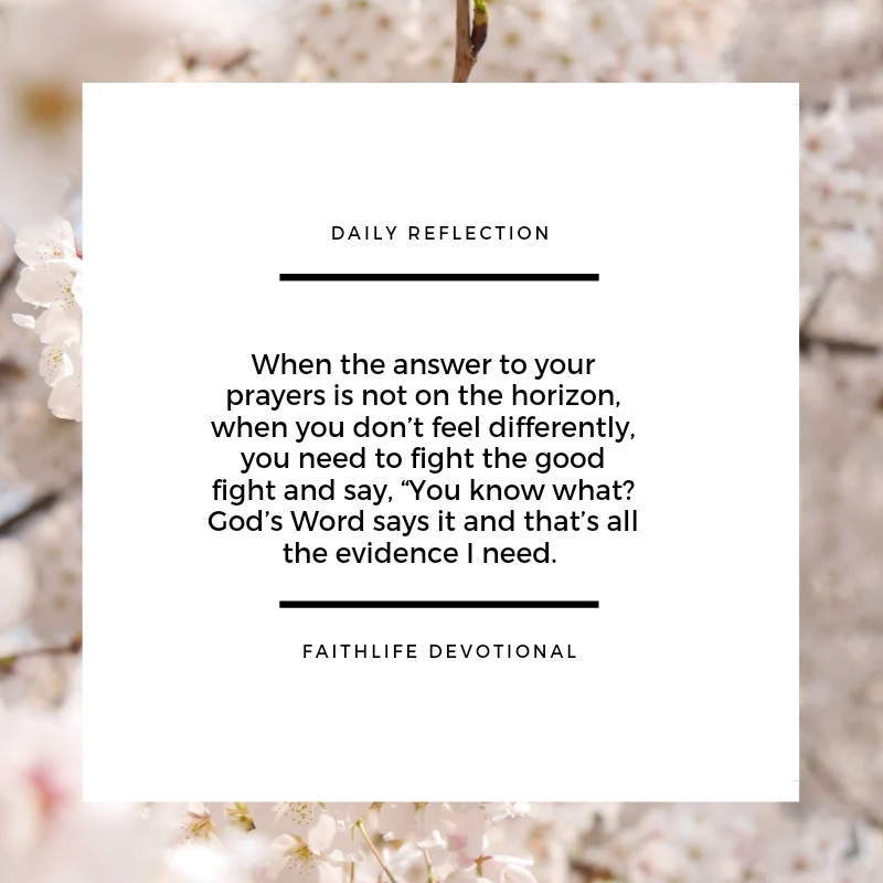 When the answer to your prayers is not on the horizon, when you don’t feel differently, you need to fight the good fight and say, “You know what? God’s Word says it and that’s all the evidence I need. It is the evidence of things not seen, and I’m going to stand on that truth. I don’t care what the world says, I don’t care what circumstances say, I am going to fight the good fight of the substance of things hoped for, the evidence of what I do not see.”