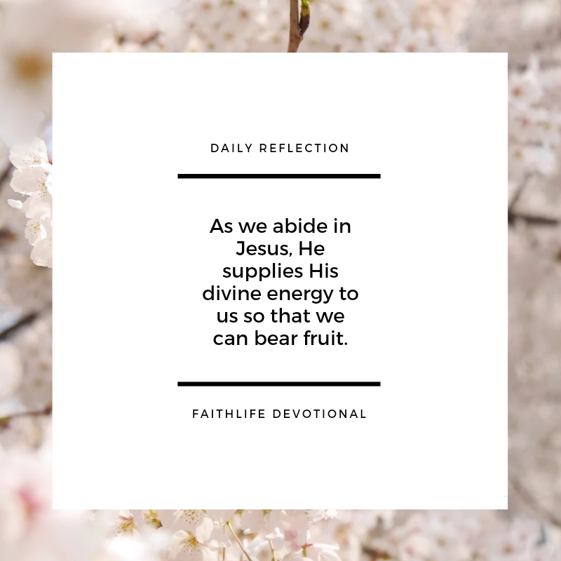 A modern-day illustration would be to consider ourselves as light bulbs. Our light will not shine unless we are plugged into the energy source. The first letters of the phrase “Always Believing In Divine Energy” is ABIDE. As we abide in Jesus, He supplies His divine energy to us so that we can bear fruit. It is the Lord who energizes our life every day!