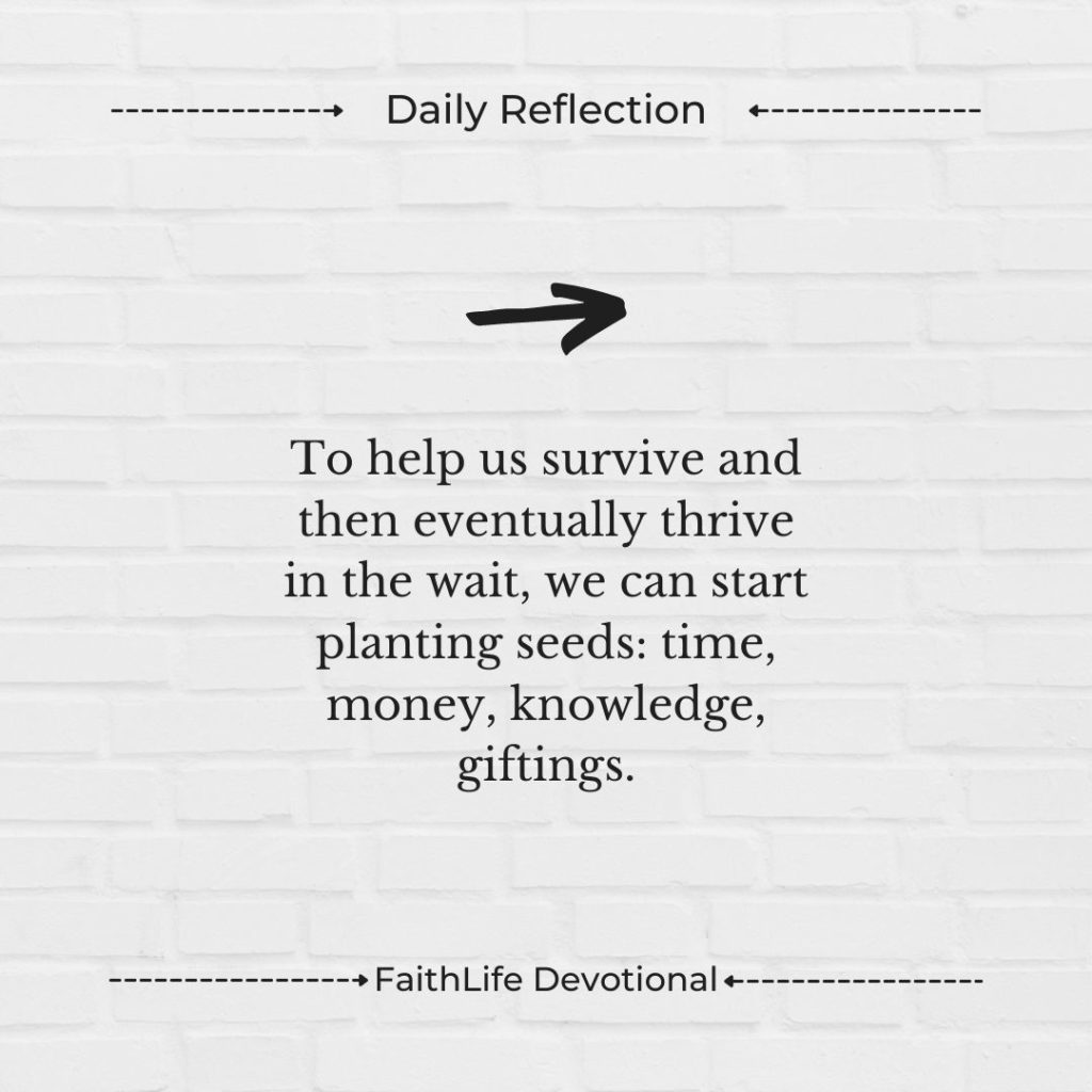 God of the seed and the harvest, thank you for this opportunity to plant while I wait. Please show me what you would have me plant today and where the fertile soil is. Thank you that you make the seeds I sow grow into unimaginable harvests when I trust you with the growing process. Thank you for letting me be part of your Kingdom-building by seed-planting! In Jesus’ name, amen.