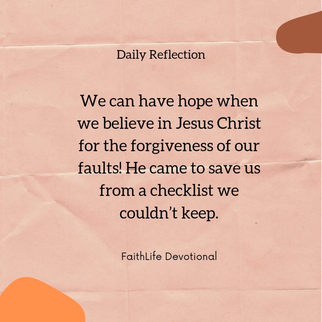 Jesus was stating that He could keep the law, and through Him, imperfect people could be forgiven of their sin and seen as perfect again by their heavenly Father. We can have hope when we believe in Jesus Christ for the forgiveness of our faults! He came to save us from a checklist we couldn’t keep.