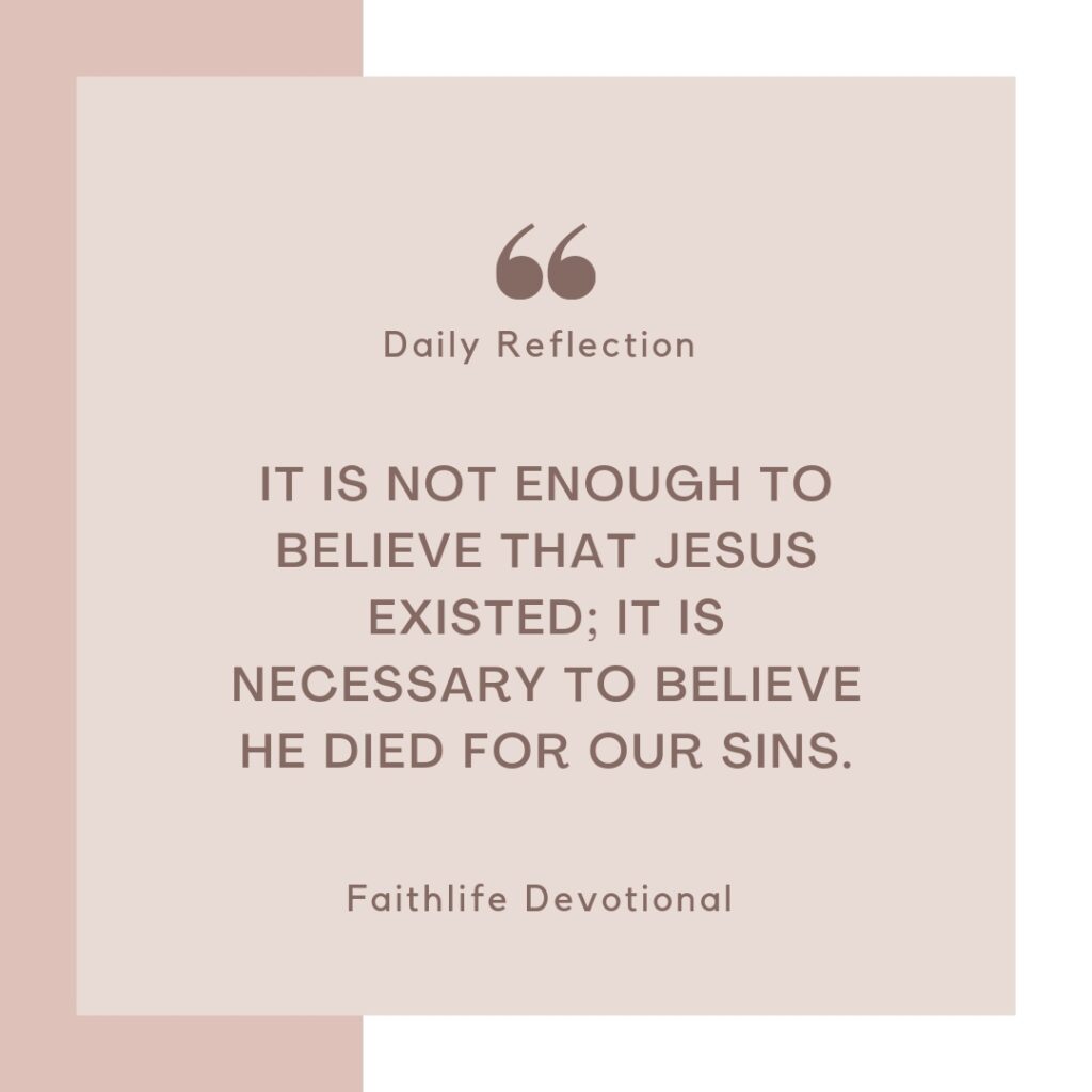 It is not enough to believe that Jesus existed; it is necessary to believe he died for our sins. Faith is the acceptance of the free gift of eternal life offered to us by God through faith in Christ. There is nothing we do to earn this gift; it is the gracious gift of God. Paul proclaims this in Romans 4:4–5 where he declares the binary options: it is either of grace or works. There is no middle ground.