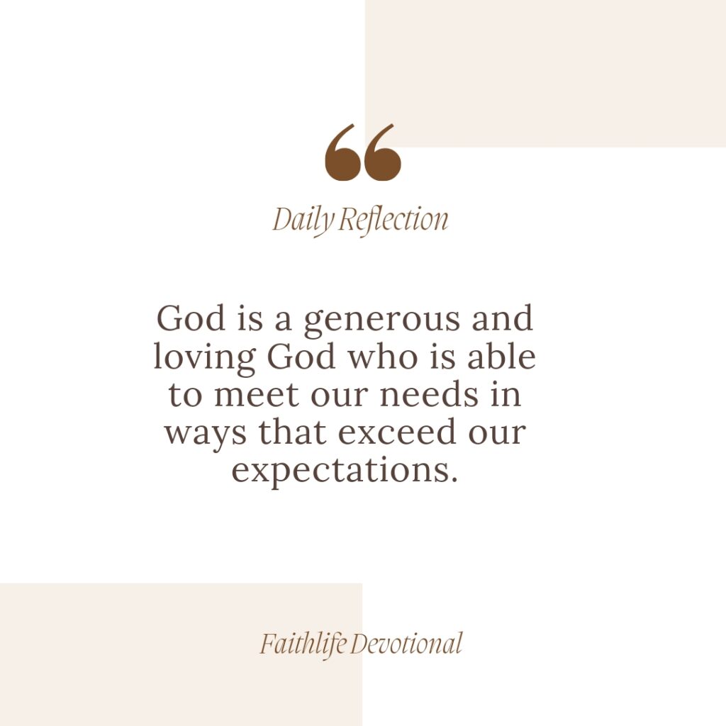 In conclusion, God is a generous and loving God who is able to meet our needs in ways that exceed our expectations. We should not limit His ability to provide for us but should exercise our faith and trust in Him. By continuously feeding on God’s Word and seeking His guidance, we can experience the fullness of His provision and care for our lives.