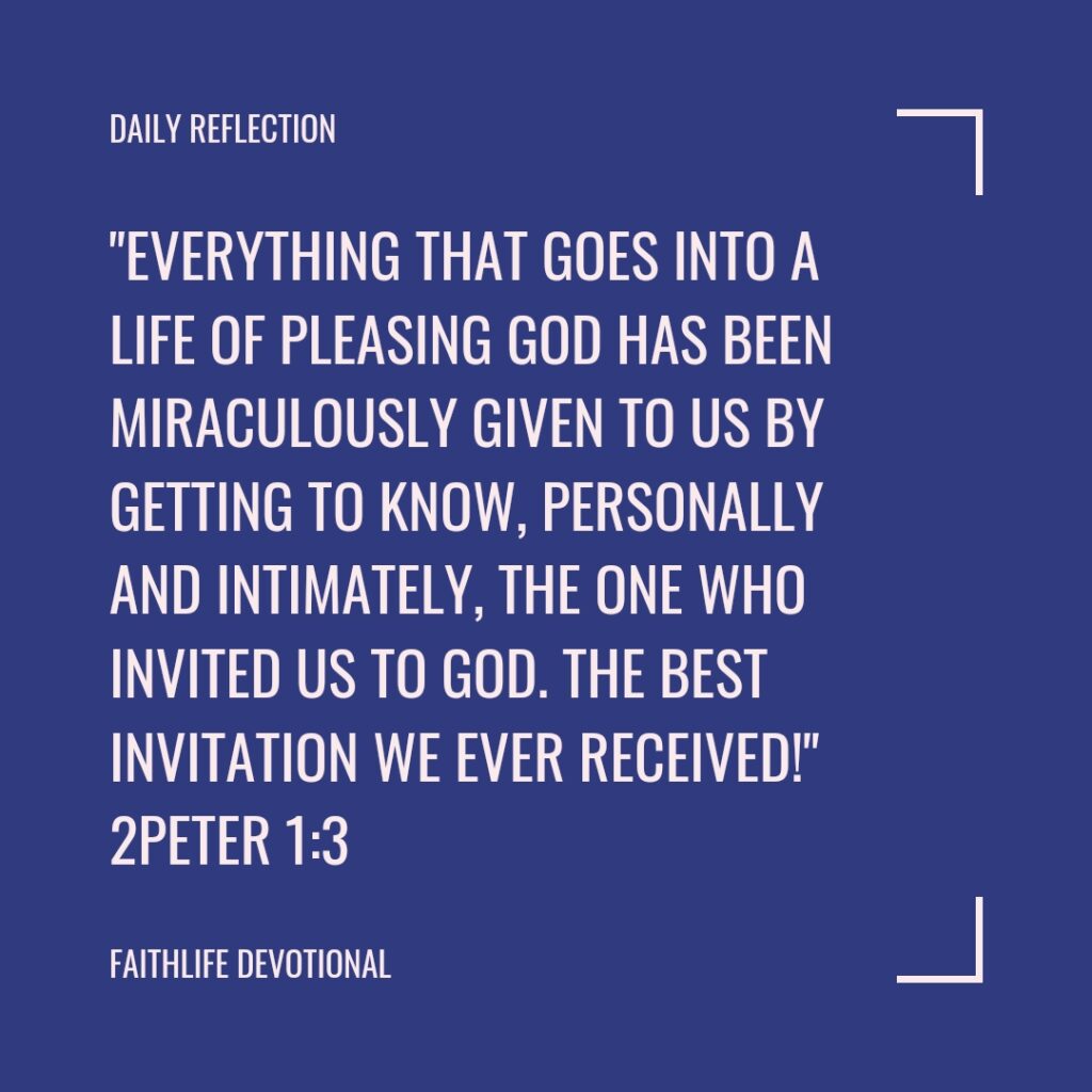 The Message translation provides a clearer explanation: “Everything that goes into a life of pleasing God has been miraculously given to us by getting to know, personally and intimately, the One who invited us to God. The best invitation we ever received!”