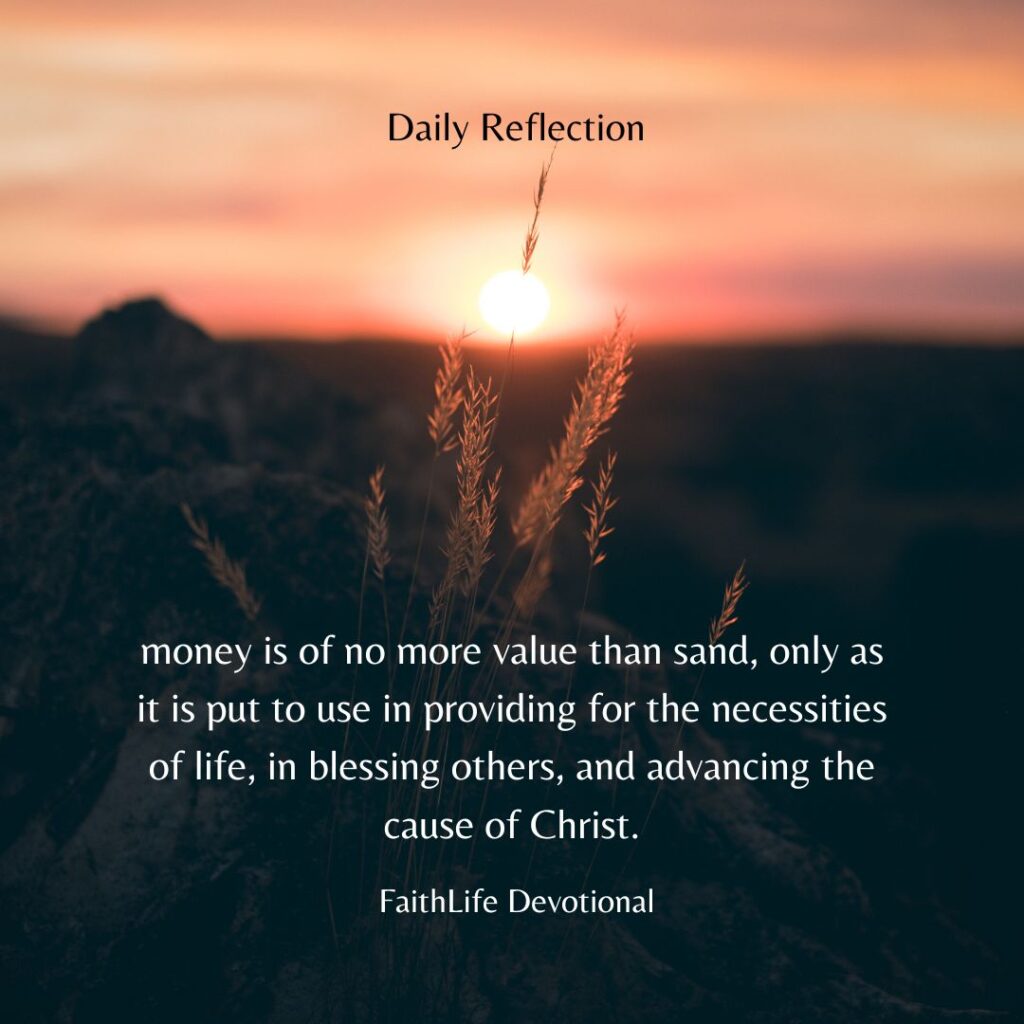 In the use of every penny, it will be seen whether we love God supremely and our neighbor as ourselves. Money has great value, because it can do great good. In the hands of God’s children it is for the cause of the kingdom, food for the hungry, drink for the thirsty, and clothing for the naked. But money is of no more value than sand, only as it is put to use in providing for the necessities of life, in blessing others, and advancing the cause of Christ.