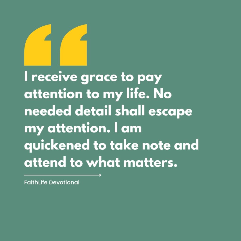 Father, I receive grace to pay attention to my life. No needed detail shall escape my attention. I am quickened to take note and attend to what matters. Amen.