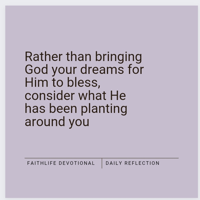 Rather than bringing God your dreams for Him to bless, consider what He has been planting around you. Maybe it’s a person or an organization. How might you be perfectly positioned to use your gifts and talents to help it grow and thrive?