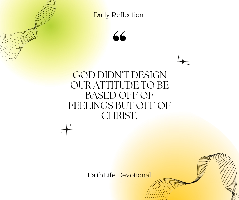 God didn’t design our attitude to be based off of feelings but off of Christ. He is constant. His truth is unchanging and ever present. God has called us to a place of freedom, even in our attitude. This place doesn’t ignore our feelings, but doesn’t force us to be ruled by them either.