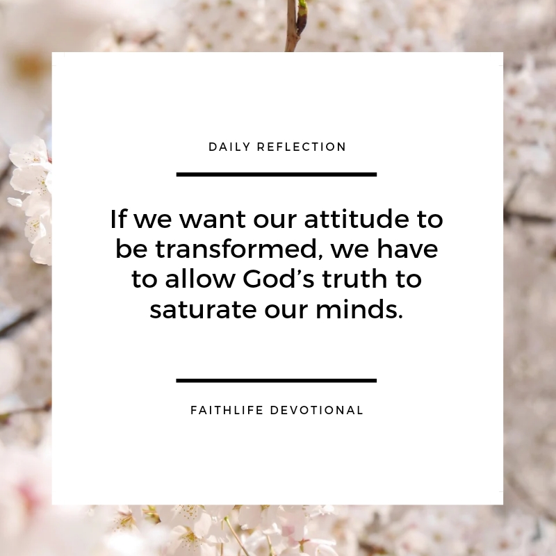 If we want our attitude to be transformed, we have to allow God’s truth to saturate our minds. Right attitudes can only be formed when we spend time letting Jesus change the way we think. As our thinking is changed, so is our heart. Over time, our attitude will begin to reflect Jesus. Life will no longer happen to us. Our situations will no longer destroy us. Instead, we will be living with the attitude that God is in control, and has entrusted us with situation in front of us. We can do all things with Him at our side, and we can do it with a godly attitude.