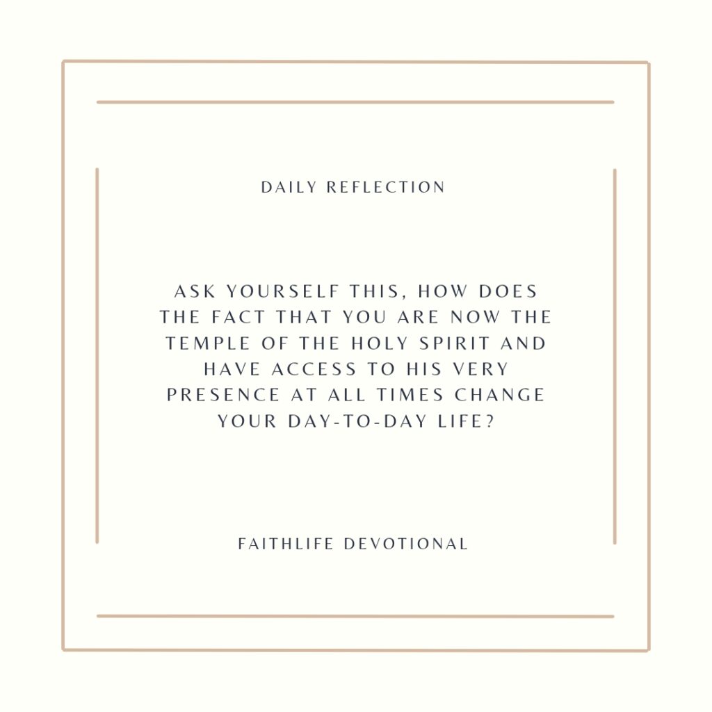 Ask yourself this, how does the fact that you are now the temple of the Holy Spirit and have access to His very presence at all times change your day-to-day life?