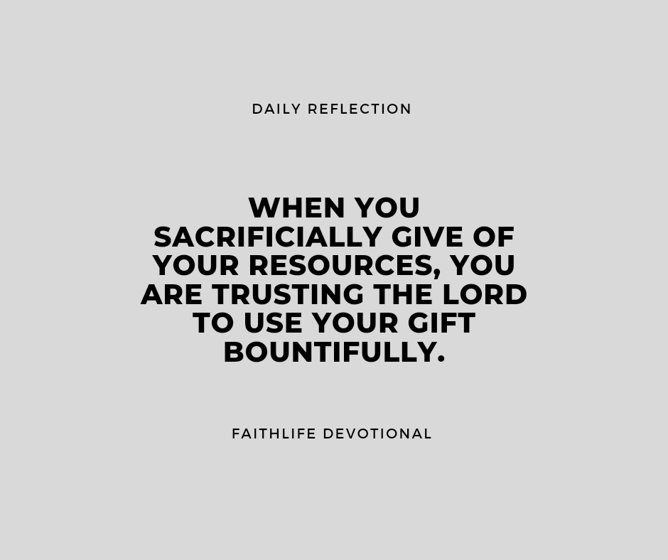 Two, it is easy to believe the lie that only large gifts can make an impact. The Lord can use our financial giving even if we can only give very small amounts. In Scripture, God joyfully accepts small gifts and multiplies them (Five loaves and two fishes in John 6, the widow of Zarephath in 1kings 17, the woman who gave her last coin in Mark 12). Do you believe the Lord will do the same with your giving? When you sacrificially give of your resources, you are trusting the Lord to use your gift bountifully. When you generously give time and energy, you are trusting that the Lord will work through you to provide for the needs of others.