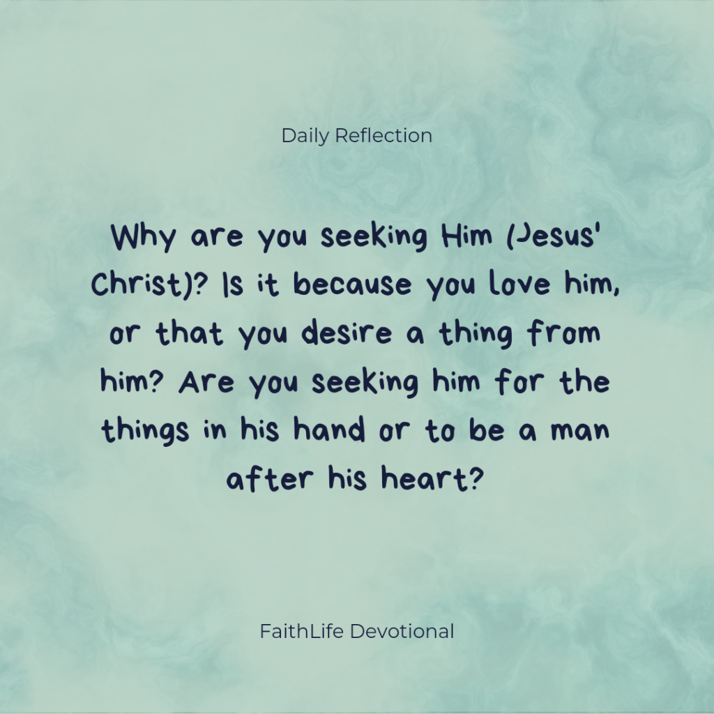 The question coming to you today by God’s spirit is; why are you seeking Him (Jesus’ Christ)? Is it because you love him, or that you desire a thing from him? Are you seeking him for the things in his hand or to be a man after his heart? The answer to the question have a lot to say about how committed you’ll be to God, with or without those things you seek. If it is just so He could meet your physical need, you are laboring for that which will perish. Labor for the meat which endures unto eternal life; believe on Jesus Christ.