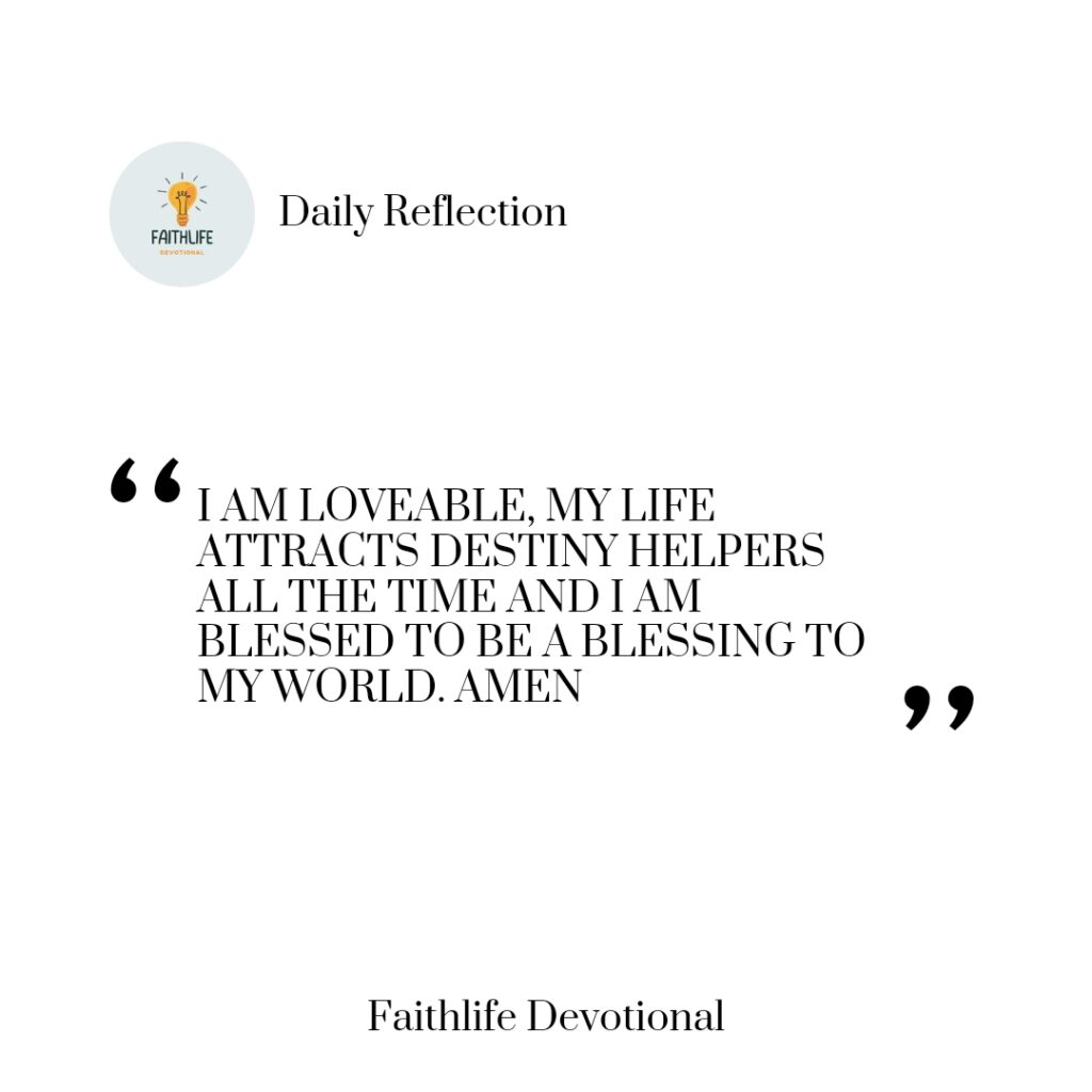 Prayer and Confession: I am loveable, my life attracts destiny helpers all the time and I am blessed to be a blessing to my world. Amen