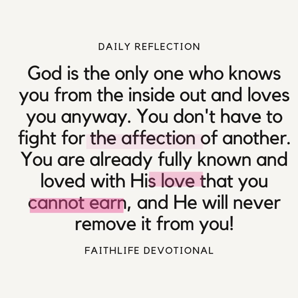 We all desperately long to be fully known, loved, and pursued, but we already are! God is the only one who knows you from the inside out and loves you anyway. You don’t have to fight for the affection of another. You are already fully known and loved with His love that you cannot earn, and He will never remove it from you!