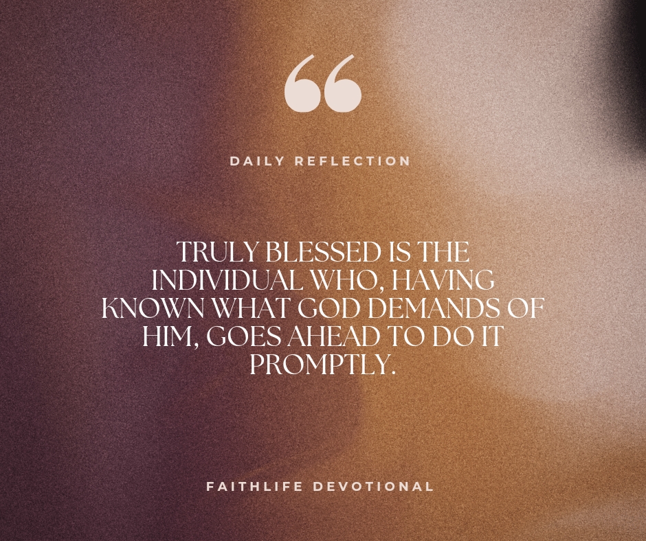 Beloved, we must treat the instructions of God and respond in obedience promptly. Truly blessed is the individual who, having known what God demands of him, goes ahead to do it promptly. In what has your obedience been delaying? Trust God for grace to be prompt in obedience.