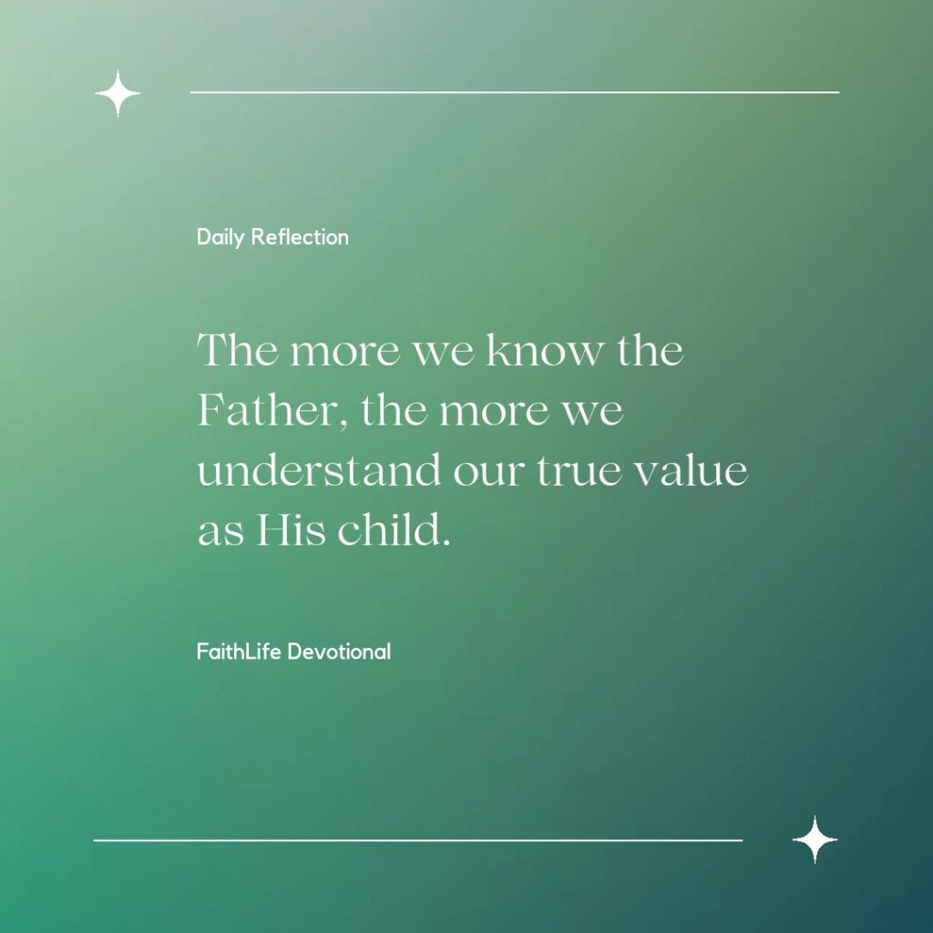 1 John 2:14 uncovers the truth of your value: “You know the Father”. This phrase is so simple. It makes us slow down. Knowing the Father is something we CAN’T rush. To be a Christian is to know the Father’s love personally and intimately. But it takes time to settle in. It’s unlike any other love we can know in human experience, and it takes a lifetime to learn it, to believe that it’s real, and to accept it personally.