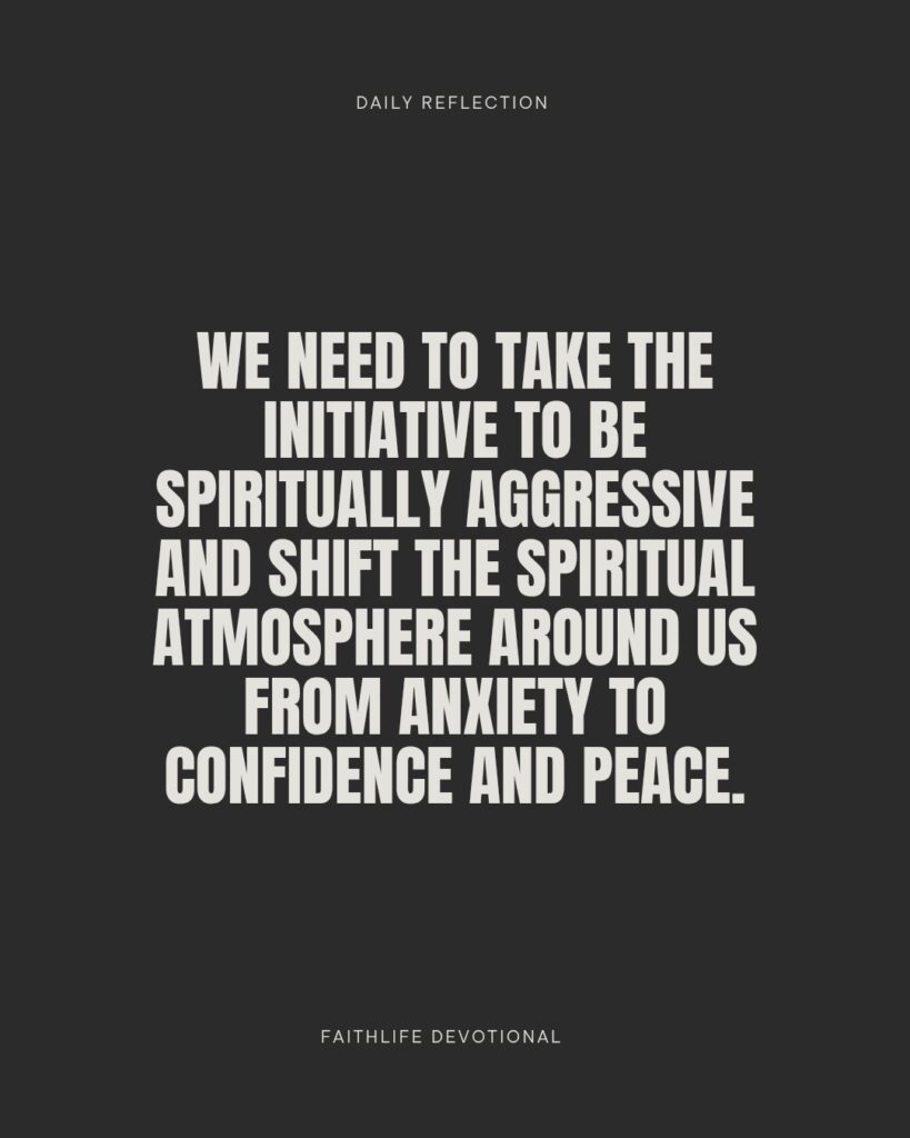 As believers that we are, we need to believe that we can experience the peace of God. But hear this—we have to do something. Paul said in 1 Timothy 6:12, “Fight the good fight of faith.” Like King David who “encouraged himself in the Lord” (1 Sam. 30:6 KJV), we have to activate ourselves. We need to take the initiative to be spiritually aggressive and shift the spiritual atmosphere around us from anxiety to confidence and peace.