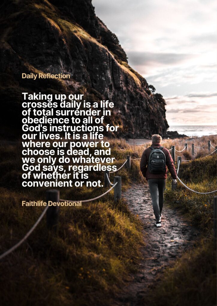 Taking up our crosses daily is a life of total surrender in obedience to all of God’s instructions for our lives. It is a life where our power to choose is dead, and we only do whatever God says, regardless of whether it is convenient or not. Are you embracing the totality of God’s plan for your life?