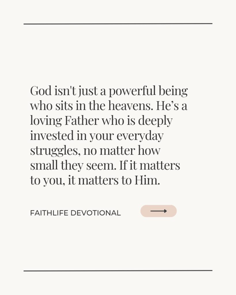 What’s beautiful about this verse is the reason God tells us to cast our anxieties on Him—it’s not just because He’s strong. It’s because He cares. God isn’t just a powerful being who sits in the heavens. He’s a loving Father who is deeply invested in your everyday struggles, no matter how small they seem. If it matters to you, it matters to Him.