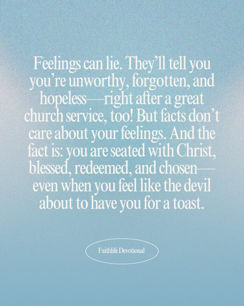 Feelings can lie. They’ll tell you you’re unworthy, forgotten, and hopeless—right after a great church service, too! But facts don’t care about your feelings. And the fact is: you are seated with Christ, blessed, redeemed, and chosen—even when you feel like the devil about to have you for a toast.