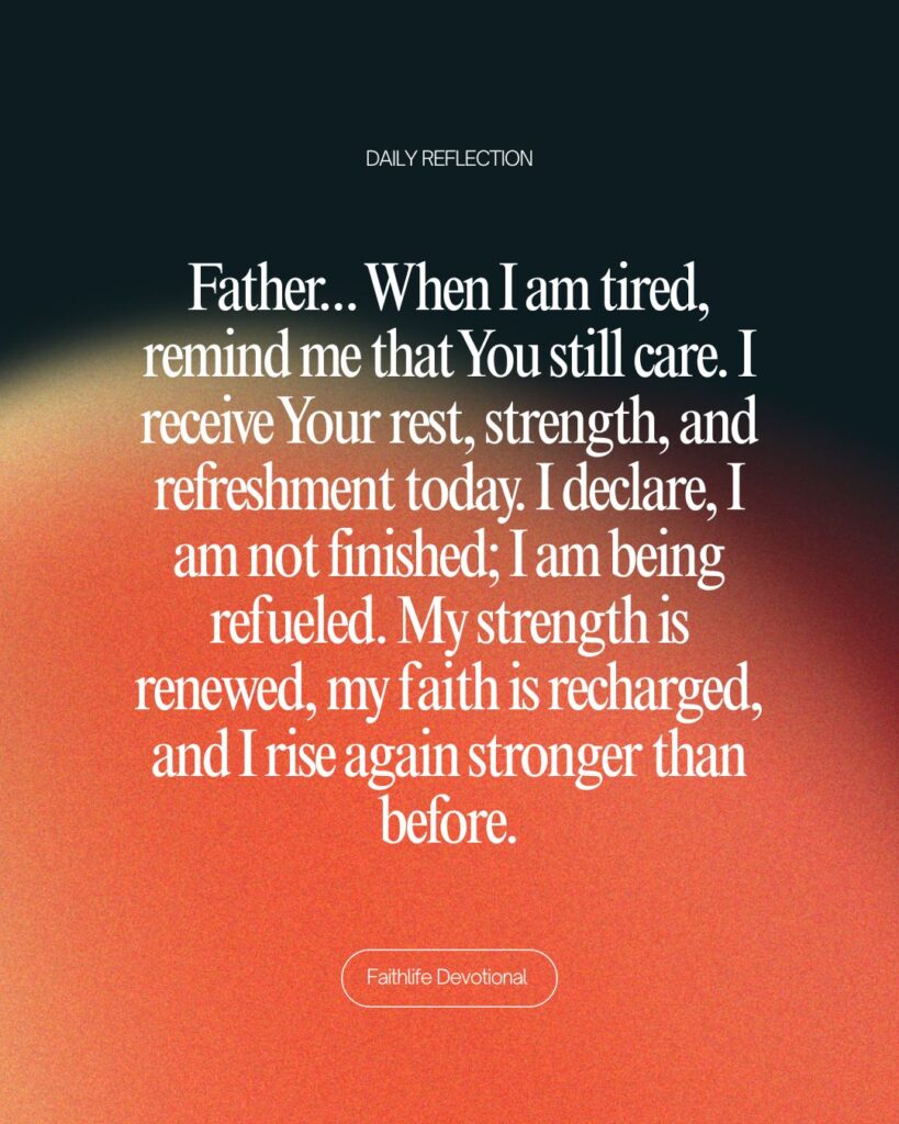 Father, thank You for understanding my humanity. When I am tired, remind me that You still care. I receive Your rest, strength, and refreshment today. I declare, I am not finished; I am being refueled. My strength is renewed, my faith is recharged, and I rise again stronger than before. Amen!