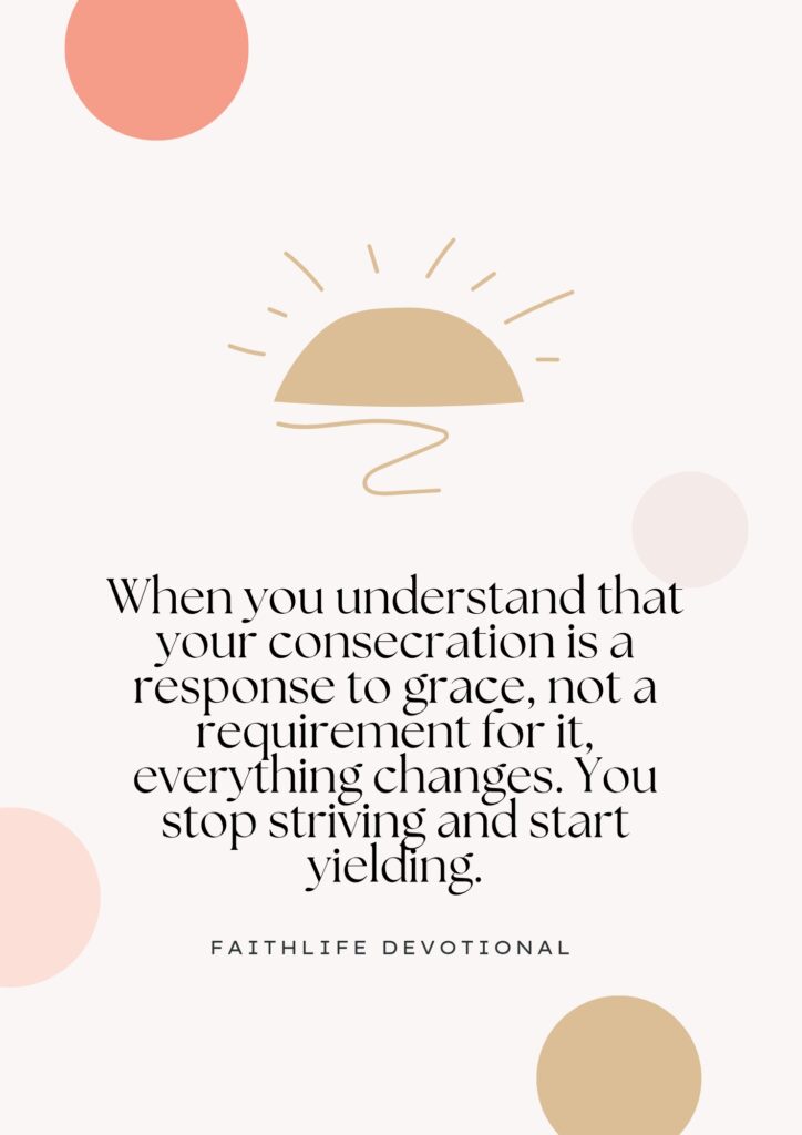 Consecration doesn’t make God love you; it helps you love Him back rightly. Religion says, “Do this to be accepted.” Grace says, “You are already accepted; now live like it.” When you understand that your consecration is a response to grace, not a requirement for it, everything changes. You stop striving and start yielding.
