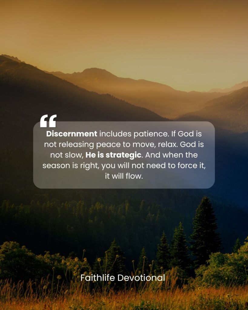 One of the biggest enemies of discernment is urgency. Not every pressure is divine. Sometimes it is your emotions, your environment, or even social media that is shouting, “Move now or you will miss out!” But God does not lead His children through panic. God’s timing is not driven by fear, it is driven by purpose. Isaiah 60:22 says God will hasten it in His time. Meaning when it is time, God does not struggle to make it happen. When God decides to move, speed enters the matter naturally. But before that time, you can run up and down like a generator with no fuel and still not produce light.